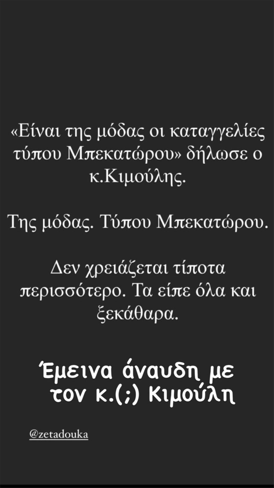 Μετά την Ζέτα Δούκα, Κατερίνα Γερονικολού, Ευδοκία Ρουμελιώτη, Αλεξάνδρα Ταβουλάρη, Κατερίνα Παπουτσάκη και Φαίη Ξυλά μίλησαν για την ψυχολογική βία και τις ύβρεις που υπέστησαν, όταν συνεργάστηκαν με τον ηθοποιό και σκηνοθέτη. Τον ασκό του Αιόλου άνοιξε η Ζέτα Δούκα, η οποία σε μια συναισθηματικά φορτισμένα στιγμή, αποκάλυψε ότι είχε δεχθεί ψυχολογική και λεκτική βία εντός και εκτός σκηνής από τον Γιώργο Κιμούλη. Μάλιστα, η ηθοποιός αποκάλυψε στην εκπομπή της Δανάης Μπάρκα ότι «ένα βράδυ, όταν καιγόταν η Αθήνα με τα γεγονότα για τον Γρηγορόπουλο, έστειλε έναν συνάδελφο να μου πει να βγω στη σκηνή και να πω ότι ακυρώνεται η παράσταση. Όταν πήγα να τον ρωτήσω γιατί δεν το λέει αυτός ως επικεφαλής, με έβρισε, με κλότσησε και είπε “ΟΚ, πάμε τρίτο κουδούνι”».