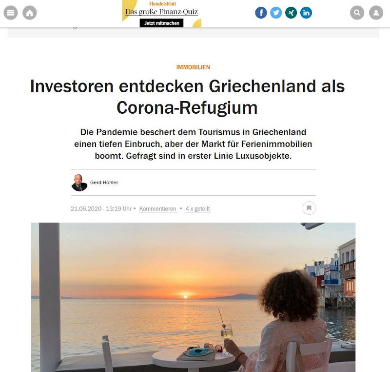 Μετά τους πρόσφατους ύμνους της γερμανικής οικονομικής εφημερίδας για το άνοιγμα του τουρισμού στην Ελλάδα, ο ανταποκριτής της, Γκερντ Χέλερ σημειώνει ότι η ζήτηση πολυτελών εξοχικών κατοικιών– παρά τη σχετικά αλμυρή τιμή τους – έχει αυξηθεί. «Γνώστες της αγοράς ακινήτων θεωρούν ότι αυτό σχετίζεται με την πανδημία του κορωνοϊού. Η ιδιωτικότητα και η ασφάλεια είναι σήμερα περισσότερο παρά ποτέ το ζητούμενο», αναφέρει παραθέτοντας τις δηλώσεις του Ελληνογερμανού Γιώργου Πέτρα, επικεφαλής στην Ελλάδα του μεσιτικού γραφείου Engel & Völkers: “Οι πελάτες μας αποζητούν την ασφάλεια και την προστασία σε δικά τους ακίνητα. Πολλοί παραθεριστές, που διέμεναν παλαιότερα σε πολυτελή ξενοδοχεία, εποφθαλμιούν τώρα μια δική τους παραθεριστική κατοικία" στην Ελλάδα, λέει, αποδίδοντάς το στην επιτυχημένη απάντηση της κυβέρνησης Μητσοτάκη στην πανδημία του κορωνοϊού, αφού η χώρα μας έχει ένα από τα χαμηλότερα ποσοστά μολύνσεων και θανάτων στη Μεσόγειο.