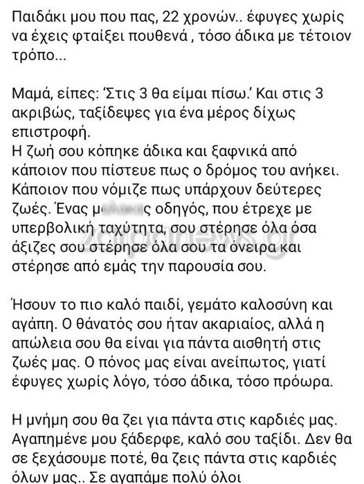 Συγκλονίζει το μήνυμα που έγραψε η ξαδέρφη του στα κοινωνικά δίκτυα, με τα τελευταία λόγια που είπε στη μητέρα του λίγο πριν συμβεί το τραγικό τροχαίο που του στέρησε τη ζωή τόσο άδικα.