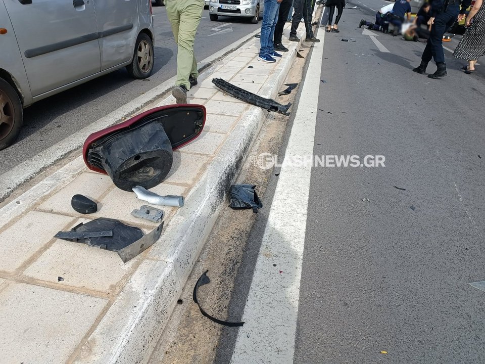 Τα συντρίμμια της μοτοσυκλέτας σκορπίστηκαν σε μεγάλη απόσταση στον δρόμο, ενώ το όχημα σταμάτησε σε απόσταση πολλών μέτρων από το σημείο του ατυχήματος.
