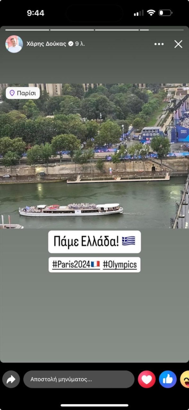 «Πάμε Ελλάδα» έγραψε σε InstaStory, δημοσιεύοντας το πλοίο όπου επέβαινε η ελληνική αποστολή, ανοίγοντας την Τελετή Έναρξης των Ολυμπιακών Αγώνων 2024.