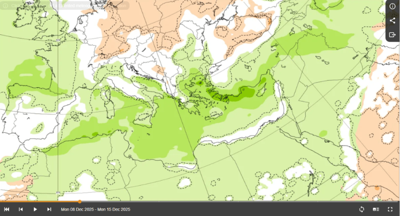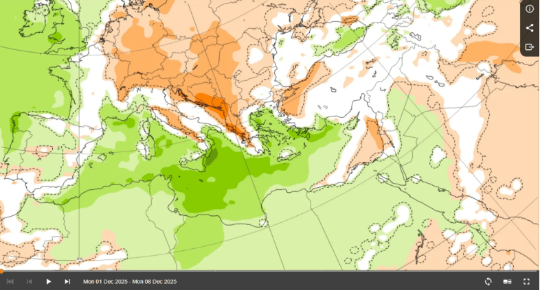 Πρώτη εβδομάδα (1–8 Δεκεμβρίου): Υγρότερη από το κανονικό η Ελλάδα – Ξηρότερη η βόρεια Βαλκανική
