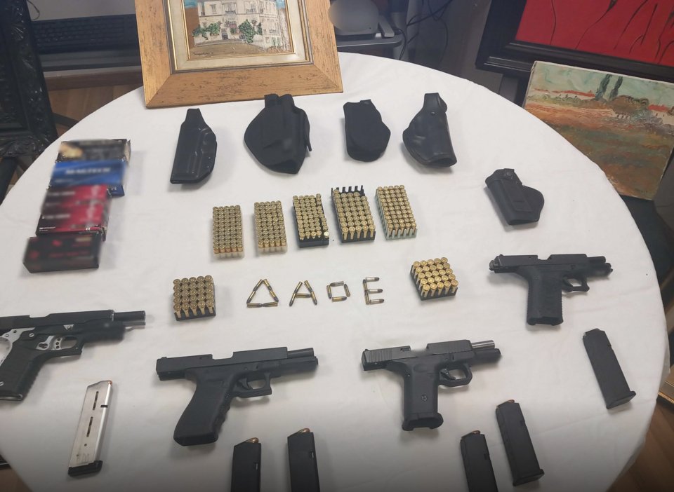 Παράλληλα, βρέθηκαν 370 φυσίγγια διαφόρων μετρημάτων, 5 θήκες πιστολιών, 2 κινητά, 1 καταγραφικό και μία οθόνη με κάρτα μνήμης.