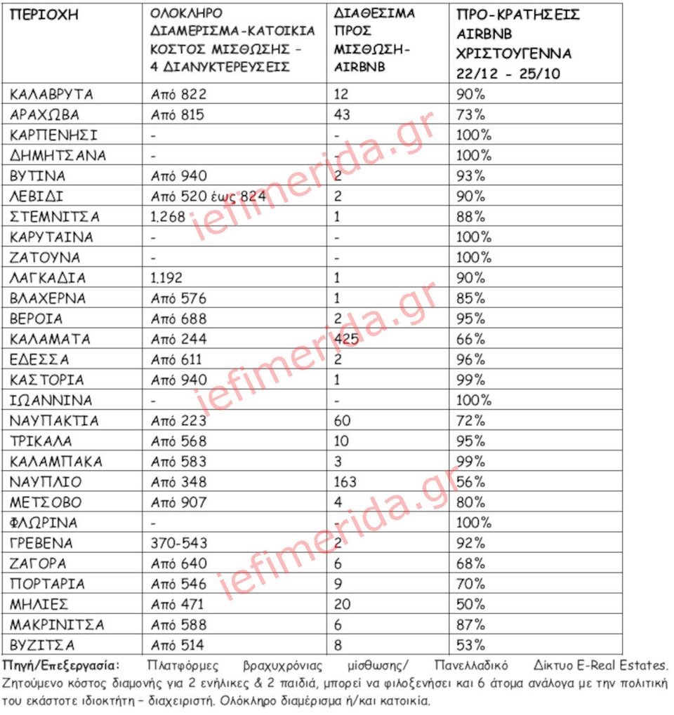 Στα Καλάβρυτα οι προ-κρατήσεις αγγίζουν το 90% για τα Χριστούγεννα, με τις ζητούμενες τιμές μίσθωσης για ολόκληρο διαμέρισμα ή/και αυτοτελή κατοικία να κυμαίνονταν από 822€ για κατοικία 40 τ.μ. και 849€ για κατοικία 65 τ.μ. Τα διαθέσιμα προς μίσθωση διαμερίσματα είναι κυρίως από 55 τ.μ. έως 75 τ.μ. και μπορούν να φιλοξενήσουν έως 6 άτομα, ανάλογα πάντα με την πολιτική του εκάστοτε ιδιοκτήτη - διαχειριστή ακινήτου.
