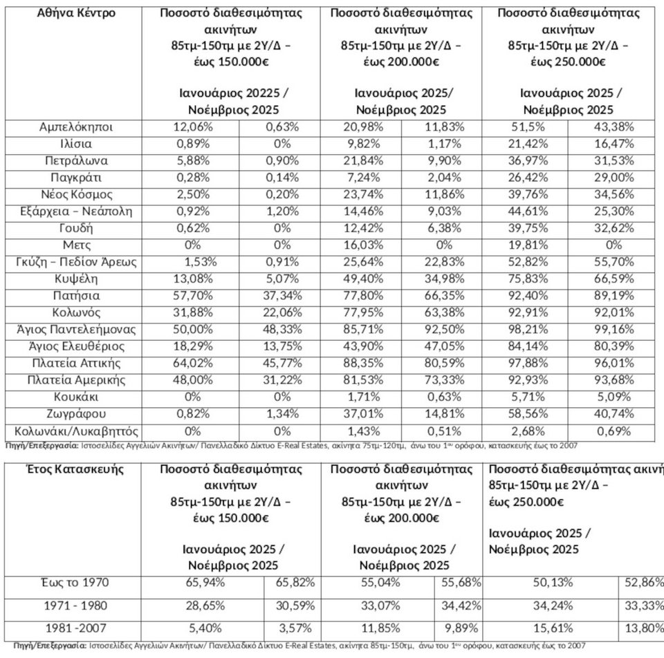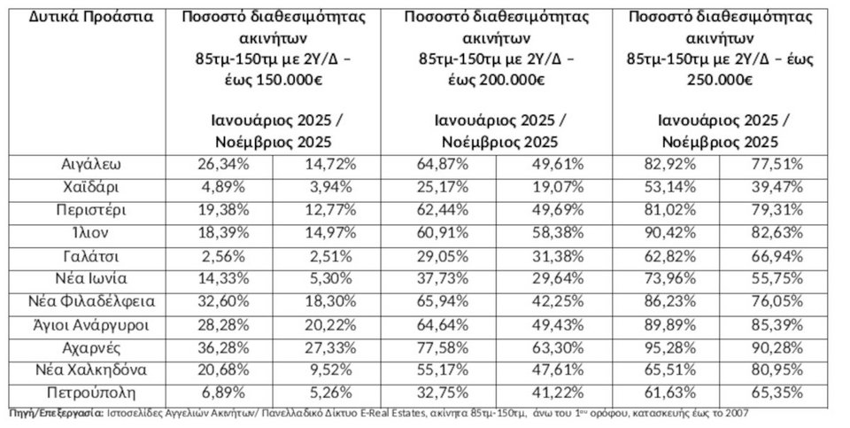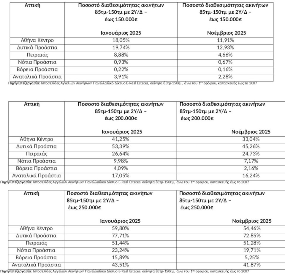 Όπως προκύπτει, η διαθεσιμότητα ακινήτων από 85 τ.μ. έως 150 τ.μ., άνω του 1ου ορόφου, με έτος κατασκευής έως το 2007 και ζητούμενη τιμή έως 150.000 €, παρουσιάζει σημαντικές διαφοροποιήσεις ανά περιοχή. Στις περιοχές του κέντρου ανέρχεται στο 11,91% (18,05% τον Ιανουάριο του 2025), στα Δυτικά Προάστια στο 12,93% (19,74% τον Ιανουάριο του 2025), ενώ στον Πειραιά καταγράφεται στο 4,66% (8,88% τον Ιανουάριο του 2025). Αντιθέτως, στις περιοχές των Νοτίων και Βορείων Προαστίων η διαθεσιμότητα είναι σχεδόν μηδενική, ενώ στα Ανατολικά Προάστια περιορίζεται στο 2,28%.