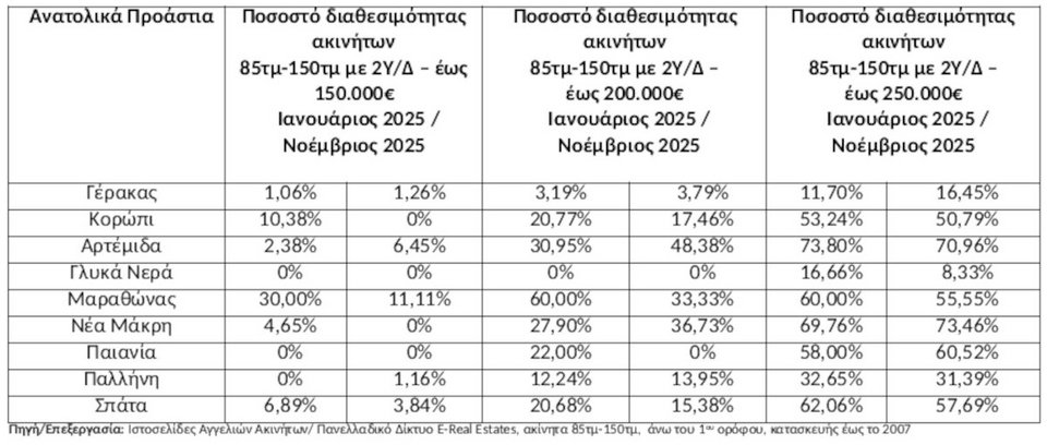 Περιοχές όπως η Νέα Μάκρη (73,46%), Αρτέμιδα (70,96%), Κορωπί (50,79%), Μαραθώνας (55,55%) και Σπάτα (57,69%) καταγράφουν υψηλή διαθεσιμότητα ακινήτων με ζητούμενη τιμή πώλησης έως 250.0000€. Περιορισμένη διαθεσιμότητα καταγράφεται στον Γέρακα (16,45%), Γλυκά Νερά (8,33%) και στη Παλλήνη (31,39%).