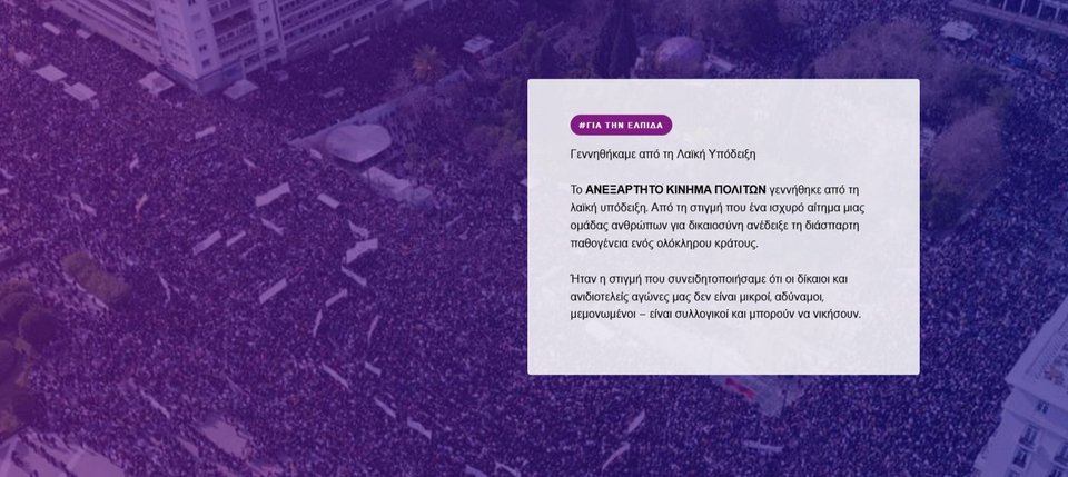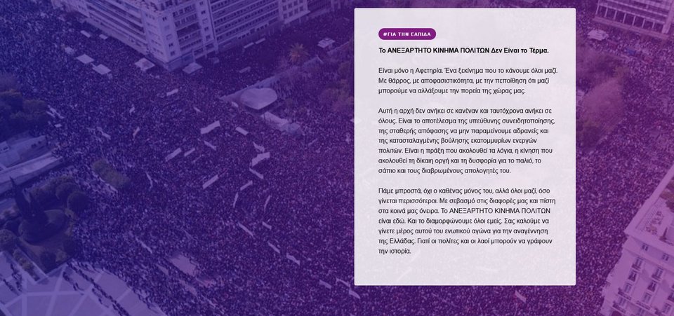 «Είμαστε ένα ΑΝΕΞΑΡΤΗΤΟ ΚΙΝΗΜΑ ΠΟΛΙΤΩΝ που γεννιέται από τη βάση, από την κοινή μας ανάγκη να έρθει επιτέλους η αλλαγή. Όλοι εμείς είμαστε άνθρωποι με διαφορετικές καταβολές, με ποικίλες διαδρομές, κινηματικές ή όχι, κάθε ηλικίας και εμπειρίας. Δεν μας χωράει μια ταμπέλα. Μας ενώνει ένα κοινό όραμα: ότι ΑΞΙΖΟΥΜΕ ΜΙΑ ΚΑΛΥΤΕΡΗ ΧΩΡΑ. Και μια κοινή ανάγκη: ΝA ΑΝΤΙΜΕΤΩΠΙΣΟΥΜΕ ΤΙΣ ΥΠΑΡΞΙΑΚΕΣ ΑΠΕΙΛΕΣ για την κοινωνία και την πατρίδα μας. Κουβαλάμε μέσα μας ιστορίες διαφορετικές, αλλά κοινά όνειρα και μεγάλη δυσπιστία σε όσους οδήγησαν τη χώρα στα σημερινά πολλαπλά αδιέξοδα.