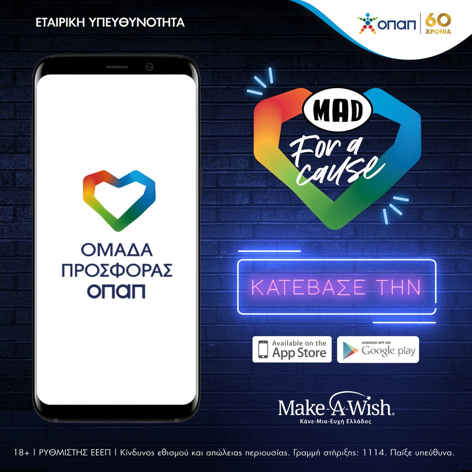 Η πρωτοβουλία «MAD for a Cause» θα τρέχει έως τις 3 Ιουνίου και μέχρι τότε μπορούμε να κατεβάσουμε δωρεάν την εφαρμογή «Ομάδα Προσφοράς», να συμμετάσχουμε στις δοκιμασίες και να μαζέψουμε πόντους για να κερδίσουμε το κοστούμι του Σάκη Ρουβά, τις μπότες της Ελένης Φουρέιρα ή το bomber jacket του SNIK. Όσο εμείς θα παίζουμε ο ΟΠΑΠ θα κάνει πραγματικότητα τις ευχές τριών παιδιών του Make-A-Wish (Κάνε-Μια-Ευχή Ελλάδος).