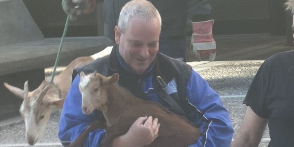 Στο βίντεο φαίνονται αστυνομικοί να κρατούν από λουριά τις κατσίκες και να προχωρούν στον δρόμο προκειμένου να τις απομακρύνουν.