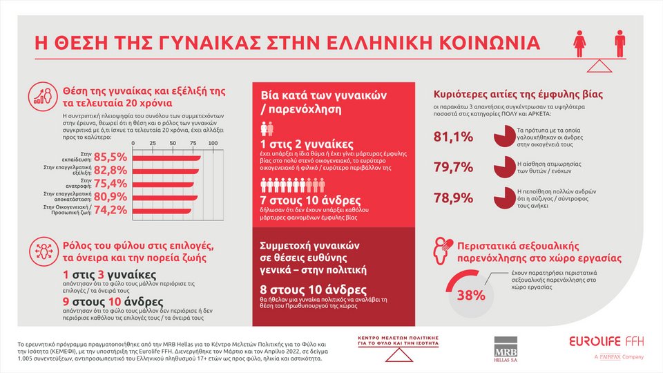 Η Πρόεδρος Δ.Σ. του Κέντρου Μελετών Πολιτικής για το Φύλο και την Ισότητα, Βουλευτής Ν.Δ. Α’ Αθηνών, Όλγα Κεφαλογιάννη, δήλωσε σχετικά: «Η σημερινή παρουσίαση των αποτελεσμάτων ενός σημαντικού ερευνητικού προγράμματος, αποτελεί ένα βήμα προόδου για τη διερεύνηση και χαρτογράφηση της θέσης της γυναίκας στην ελληνική κοινωνία. Πρόκειται για μια εξαιρετική εργασία. Μια σημαντική πηγή γνώσης και κατανόησης των στάσεων και των αντιλήψεων της κοινής γνώμης για τον ρόλο της γυναίκας σήμερα, σε μια ιστορική περίοδο μετάβασης, όπου καλούμαστε να αντιμετωπίσουμε τεράστιες προκλήσεις. Προκλήσεις απέναντι στις οποίες χρειάζεται να οικοδομήσουμε βιώσιμες οικονομίες και ανθεκτικές κοινωνίες, περισσότερο δίκαιες και δημοκρατικές. Αντίθετα, όμως, όλες και όλοι βλέπουμε καθημερινά ότι συγκεκριμένες πτυχές κοινωνικών ανισοτήτων, όπως είναι οι έμφυλες ανισότητες, όχι μόνο δεν αμβλύνονται, αλλά δυστυχώς οξύνονται περισσότερο. Χαρακτηριστικότερο παράδειγμα είναι η αύξηση των γυναικοκτονιών στην Ελλάδα. Ένα φαινόμενο που εντείνεται διαρκώς, σοκάρει, αλλά κυρίως μας επιβάλλει να δράσουμε άμεσα και αποτελεσματικά. Απέναντι, λοιπόν, σε αυτή τη σκληρή πραγματικότητα που διαμορφώνεται και τις πολλαπλές προκλήσεις που αντιμετωπίζουμε, φιλοδοξούμε να δημιουργήσουμε ένα πεδίο παρεμβάσεων, για να κινητοποιήσουμε δυνάμεις προς την κατεύθυνση επίτευξης της ισότητας των φύλων και της κοινωνικής ισότητας συνολικά. Από την πρώτη στιγμή, άλλωστε, που γεννήθηκε η ιδέα της ίδρυσης του Κέντρου Μελετών Πολιτικής για το Φύλο και την Ισότητα, πιστέψαμε ότι ο δημόσιος διάλογος και οι παρεμβάσεις στη δημόσια σφαίρα είναι ο δρόμος που θα μας φέρει πιο κοντά στον στόχο μας. Στην αναζήτηση δηλαδή, των κατάλληλων δράσεων αλλά και των πολιτικών προτάσεων για την προαγωγή των ανθρωπίνων δικαιωμάτων και της ισότητας. Θα ήθελα να ευχαριστήσω θερμά τη Eurolife FFH αλλά και την MRB HELLAS A.E. για την πολύτιμη συνεργασία που είχαμε, ώστε να πραγματοποιηθεί με επιτυχία αυτή η μελέτη, που αποτελεί ένα σημαντικό βήμα στην κατεύθυνση της άρσης των έμφυλων ανισοτήτων, της επίτευξης της κοινωνικής δικαιοσύνης, της προόδου και ευημερίας της κοινωνίας μας».