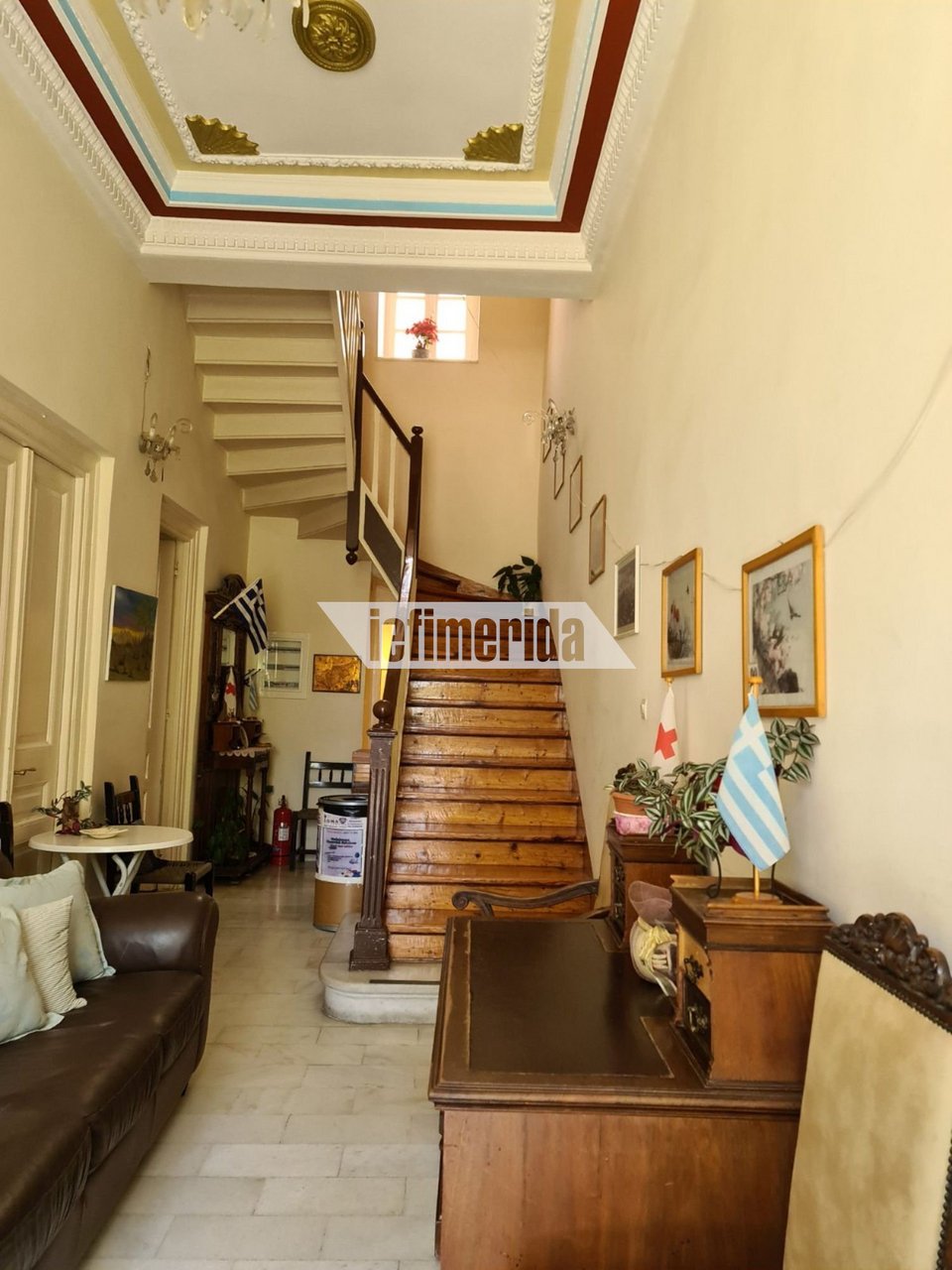 Ο εντυπωσιακός πολυέλαιος που κρέμεται πάνω από την ξύλινη εσωτερική σκάλα φωτίζει ακόμα τα αποτυπώματα της πριγκίπισσας Αλίκης στο Νέο Ηράκλειο , μόλις λίγα χιλιόμετρα από το κέντρο της Αθήνας.