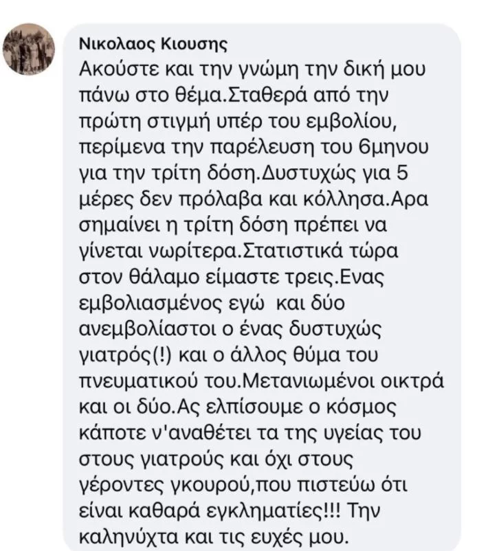 «Ακούστε και την γνώμη την δική μου πάνω στο θέμα. Σταθερά από την πρώτη στιγμή υπέρ του εμβολίου, περίμενα την παρέλευση του 6μήνου για την τρίτη δόση. Δυστυχώς, για 5 μέρες δεν πρόλαβα και κόλλησα. Άρα σημαίνει η τρίτη δόση πρέπει να γίνεται νωρίτερα. Στατιστικά τώρα, στον θάλαμο είμαστε τρεις. Ένας εμβολιασμένος, εγώ, και δύο ανεμβολίαστοι, ο ένας δυστυχώς γιατρός(!) και ο άλλος θύμα του πνευματικού του. Μετανιωμένοι οικτρά και οι δύο. Ας ελπίσουμε ο κόσμος κάποτε ν’ αναθέτει τα της υγείας του στους γιατρούς και όχι στους γέροντες γκουρού, που πιστεύω ότι είναι καθαρά εγκληματίες!!! Την καληνύχτα και τις ευχές μου».