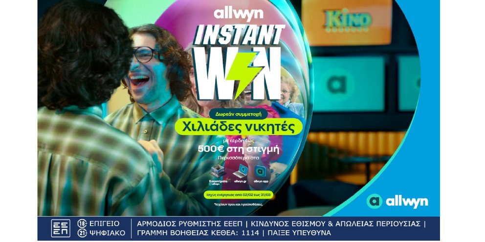 Η Allwyn καλωσορίζει τη νέα εποχή στη διασκέδαση με το Instant Win, τη συναρπαστική εμπειρία που μοιράζει σε χιλιάδες τυχερούς κέρδη στη στιγμή.
