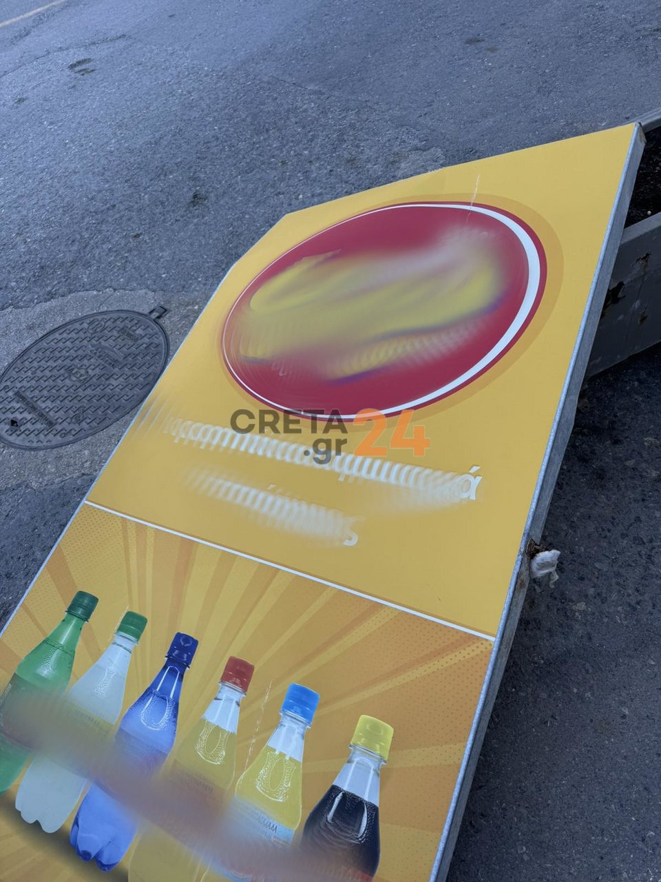 Το καπάκι λαμαρίνας προσγειώθηκε στις ζαρντινιέρες που βρίσκονται μπροστά από το κατάστημα, προκαλώντας φθορές και σε ένα σταθμευμένο αυτοκίνητο.
