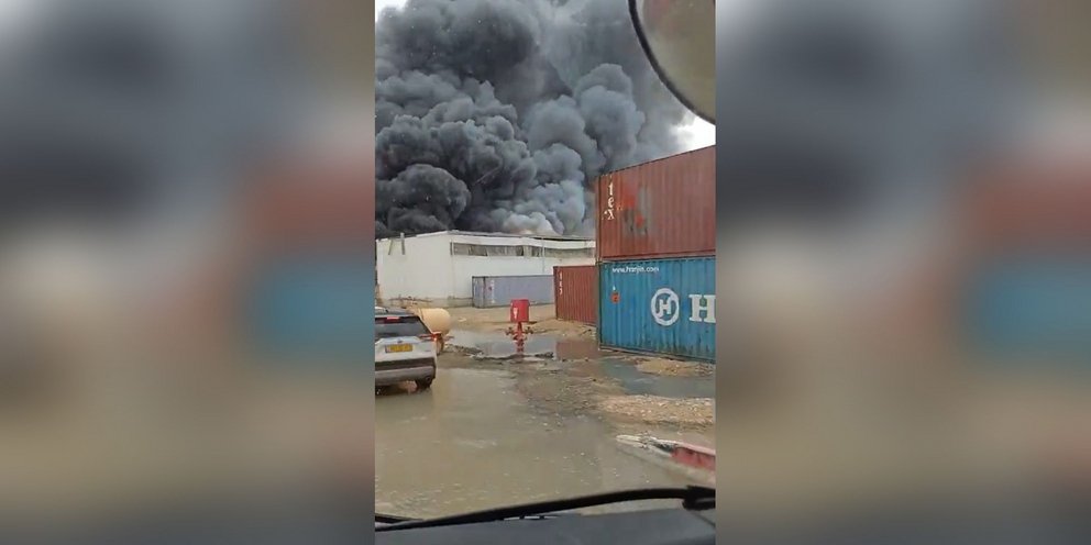 Η επίθεση φέρεται να προκάλεσε άμεση ανάφλεξη σε εγκαταστάσεις της βιομηχανικής ζώνης, με τις φλόγες να εξαπλώνονται γρήγορα στην περιοχή.