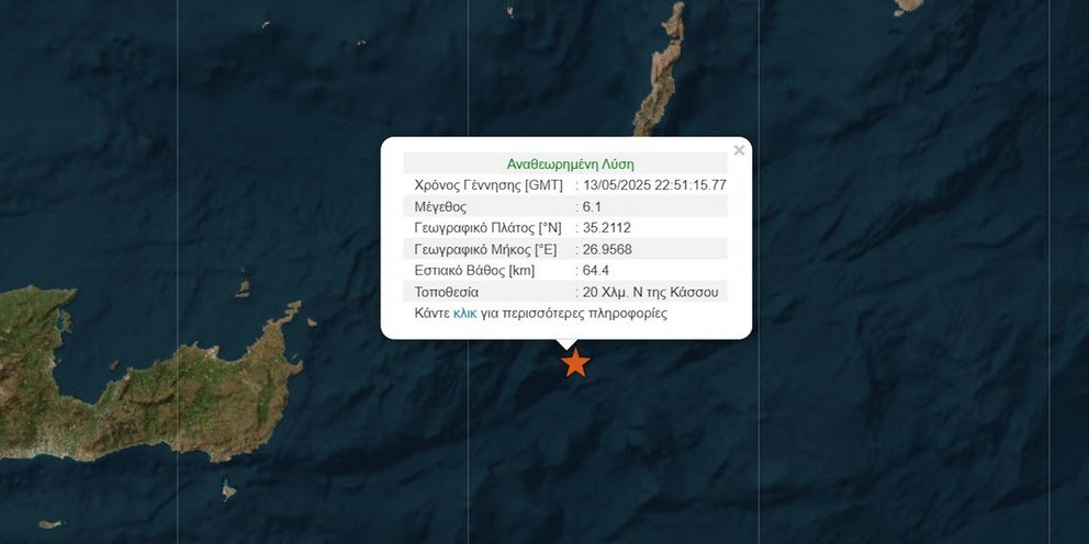 Ισχυρή σεισμική δόνηση 6,1 Ρίχτερ σημειώθηκε στις 01:50 τα ξημερώματα μεταξύ Κάσου και Καρπάθου, σύμφωνα με την αναθεωρημένη λύση του Γεωδυναμικού Ινστιτούτου.