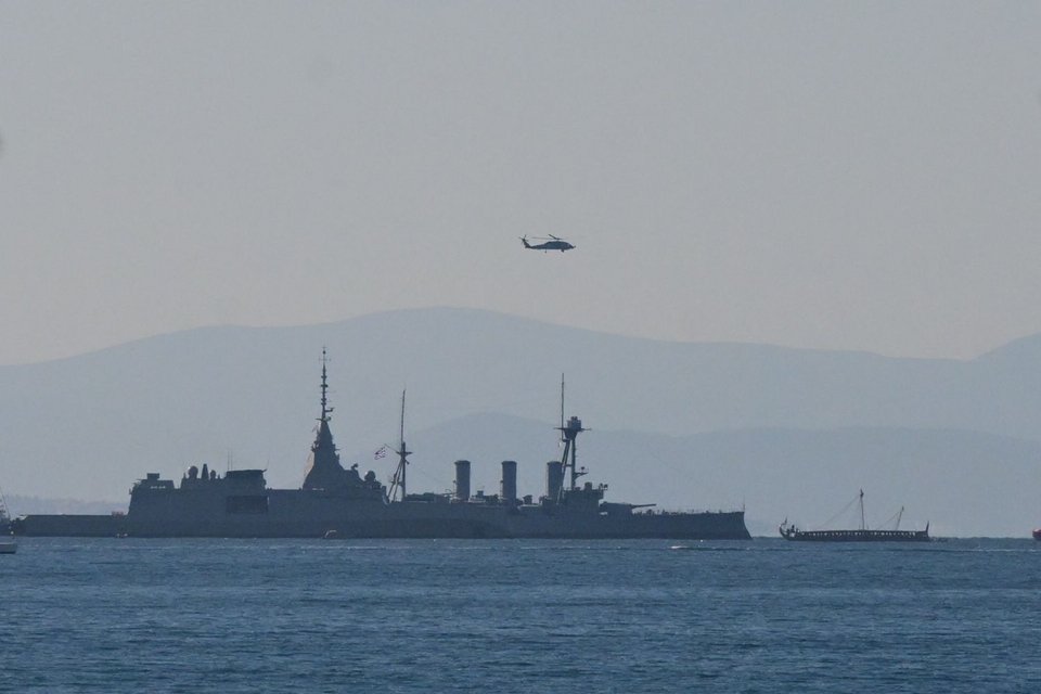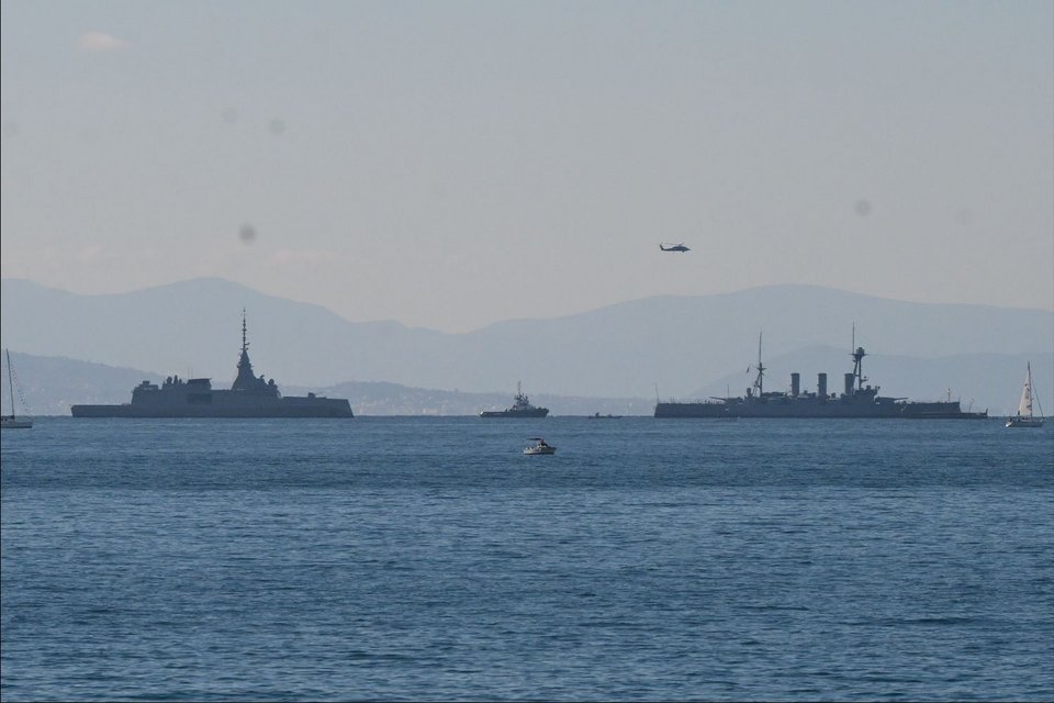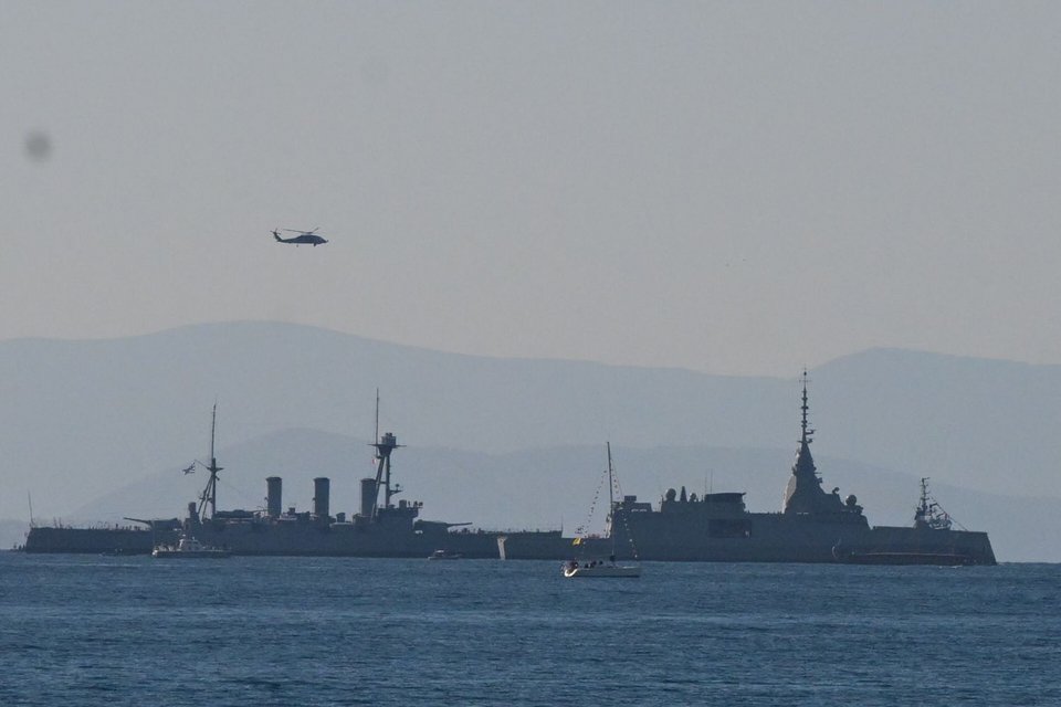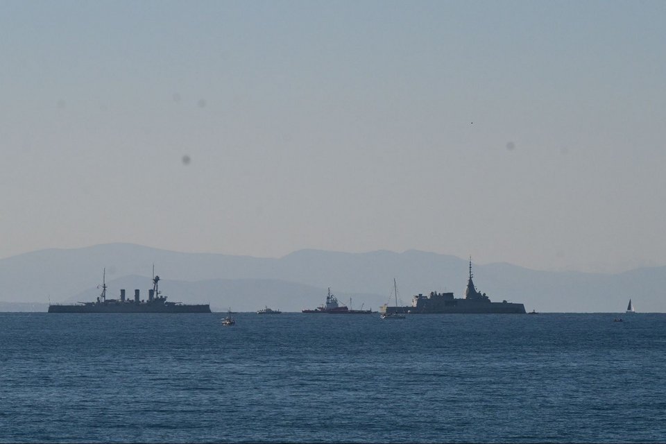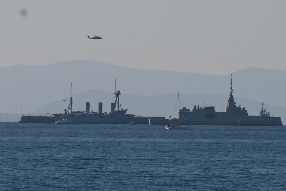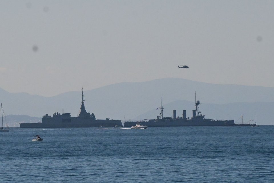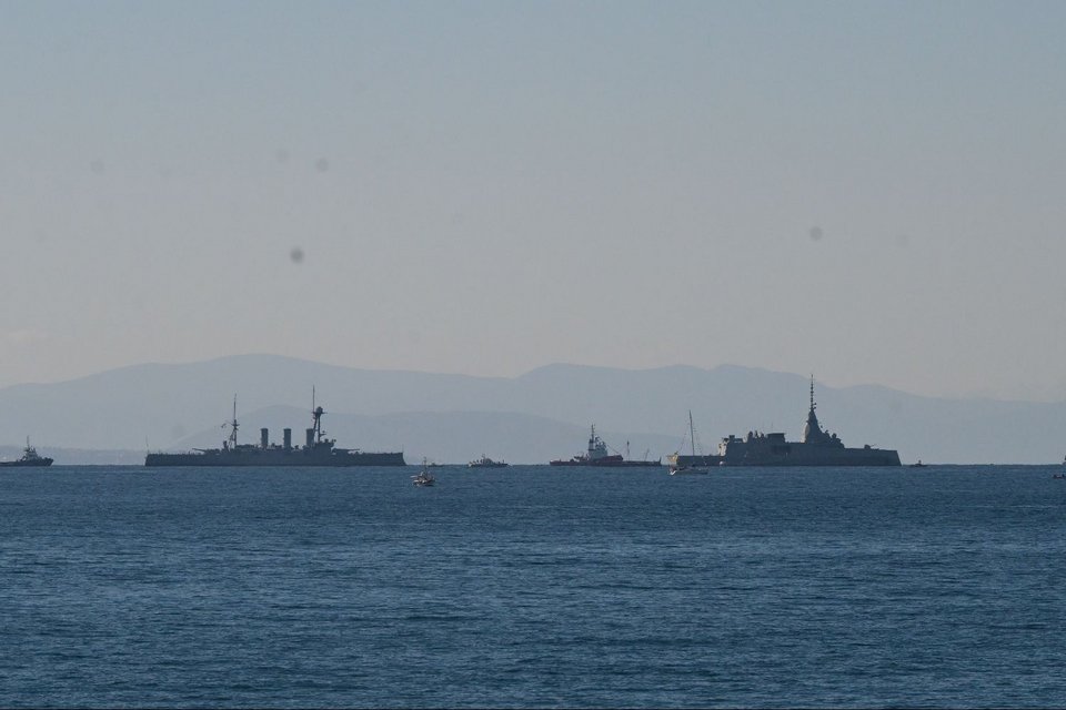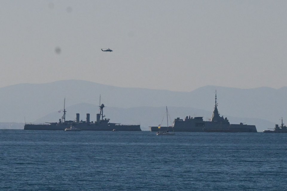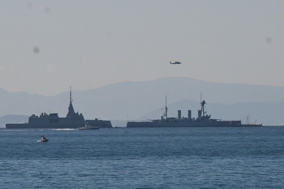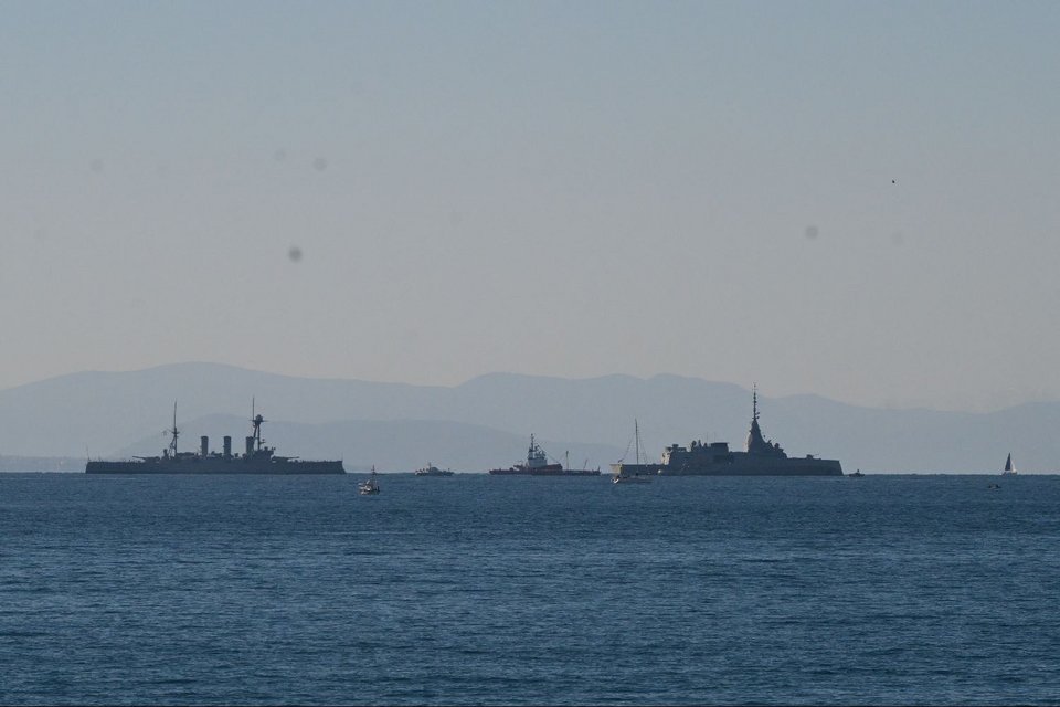 Λίγο μετά τις 12:00 καταγράφηκαν ιστορικές στιγμές όταν το θωρηκτό «Αβέρωφ» και η τριήρης «Ολυμπιάς» απέδωσαν τιμές στη φρεγάτα Belharra «Κίμων».