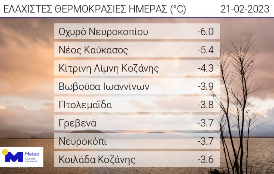 Σύμφωνα με το δίκτυο αυτόματων μετεωρολογικών σταθμών του Εθνικού Αστεροσκοπείου Αθηνών / meteo.gr οι οκτώ χαμηλότερες ελάχιστες θερμοκρασίες της ημέρας, παρουσιάζονται στον παρακάτω πίνακα:
