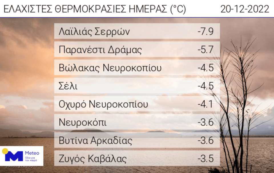 Σύμφωνα με το δίκτυο αυτόματων μετεωρολογικών σταθμών του Εθνικού Αστεροσκοπείου Αθηνών/meteo.gr, τις πρωινές ώρες της Τρίτης 20/12 ο υδράργυρος πλησίασε τους -8 βαθμούς Κελσίου στα βόρεια ορεινά. Στον πίνακα που ακολουθεί παρουσιάζονται οι 8 σταθμοί που κατέγραψαν τις χαμηλότερες ελάχιστες θερμοκρασίες: