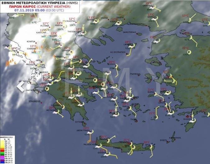 Ανεμοι: Από νότιες διευθύνσεις 3 με 5 και στα ανατολικά τοπικά 6 μποφόρ. Θερμοκρασία: Από 10 έως 25 βαθμούς Κελσίου. Στη δυτική Μακεδονία 3 με 4 βαθμούς χαμηλότερη.