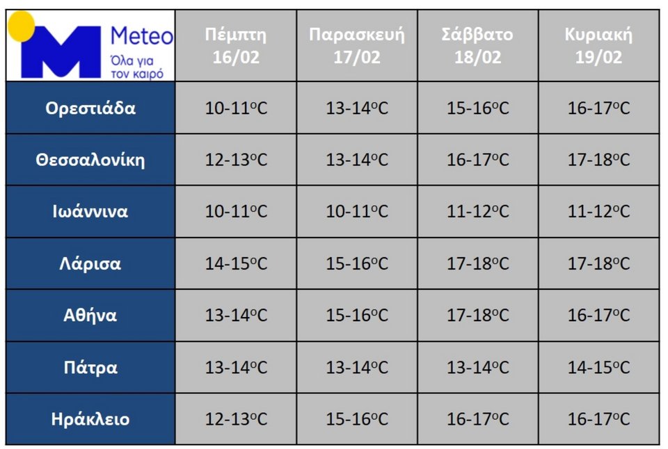 Στον πίνακα που ακολουθεί παρουσιάζονται οι μέγιστες θερμοκρασίες που αναμένονται σε 7 επιλεγμένες πόλεις της χώρας κατά τις επόμενες ημέρες: