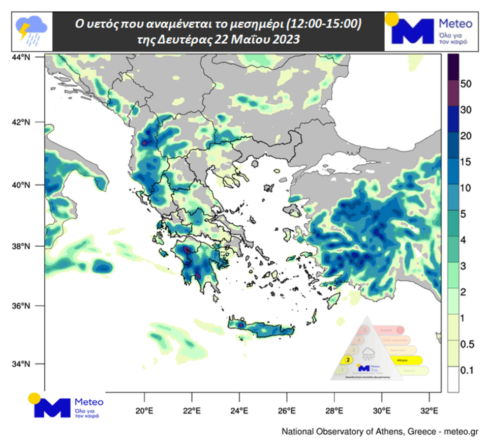 Στους Χάρτες 1 και 2 που ακολουθούν παρουσιάζεται ενδεικτικά ο υετός που αναμένεται το μεσημέρι (12:00 – 15:00) και τις πρώτες απογευματινές ώρες (15:00-18:00) της Δευτέρας 22/05: