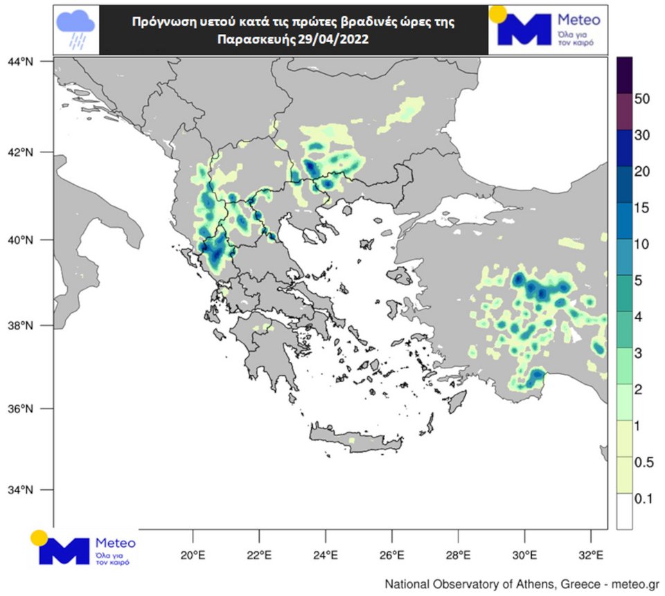 Η μεταβολή του καιρού ήδη ξεκίνησε από το απόγευμα της Παρασκευής 29/04. Τοπικές βροχές και σποραδικές καταιγίδες κάνουν την εμφάνισή τους κυρίως σε ορεινές και ημιορεινές περιοχές των δυτικών και βορείων τμημάτων της χώρας.