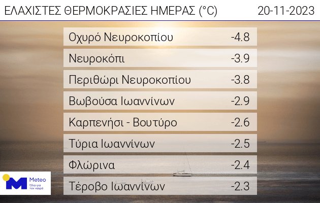 Στον πίνακα που ακολουθεί παρουσιάζονται οι 8 μετεωρολογικοί σταθμοί (εκτός χιονοδρομικών κέντρων) του δικτύου του Εθνικού Αστεροσκοπείου Αθηνών που κατέγραψαν τις χαμηλότερες θερμοκρασίες το πρωί της Δευτέρας 20 Νοεμβρίου: