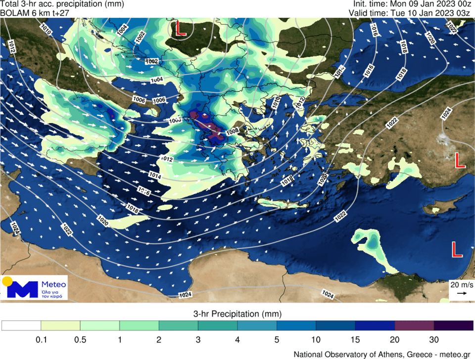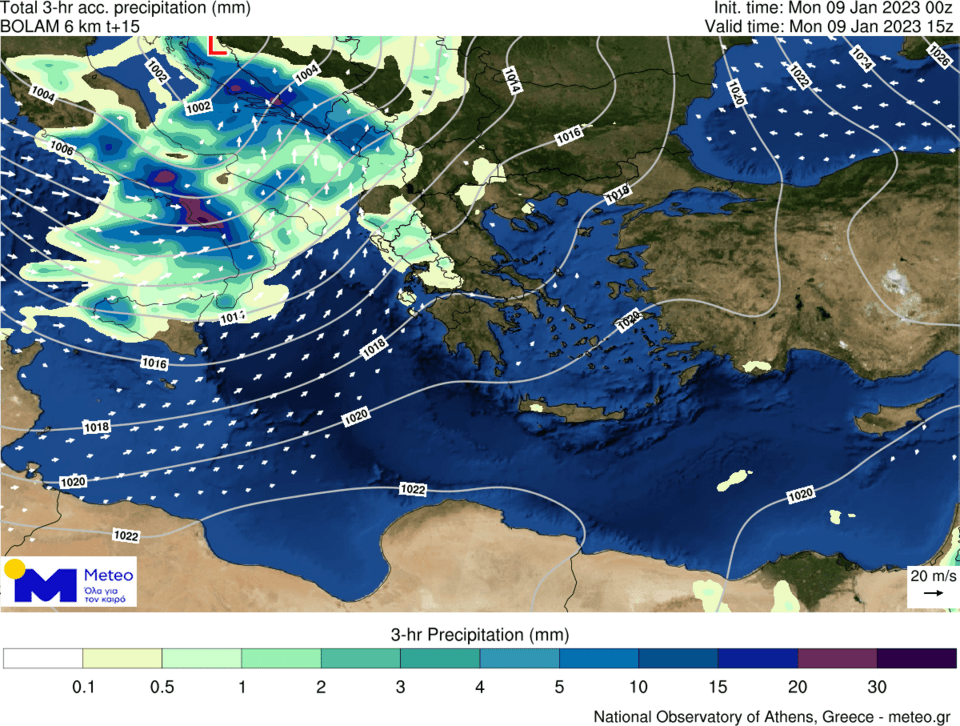 Σύμφωνα με τα προγνωστικά στοιχεία του Εθνικού Αστεροσκοπείου Αθηνών, βαρομετρικό χαμηλό στην Αδριατική, κινούμενο αρχικά αργά ανατολικά και στη συνέχεια αργά νοτιοανατολικά, θα προκαλέσει κύμα κακοκαιρίας που ήδη έχει ξεκινήσει από τις απογευματινές ώρες της Δευτέρας (9/1) και το οποίο αναμένεται να κρατήσει έως το πρωί της Πέμπτης (12/1).