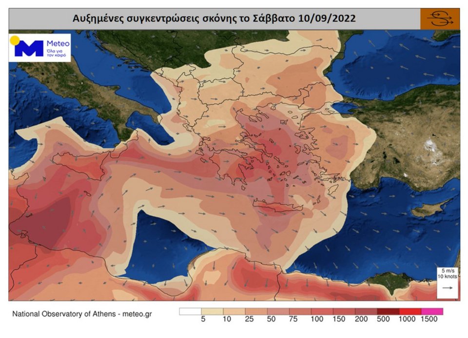Στον προγνωστικό χάρτη που ακολουθεί παρουσιάζεται η διασπορά της σκόνης στην ατμόσφαιρα κατά τη διάρκεια του Σαββάτου 10 Σεπτεμβρίου.
