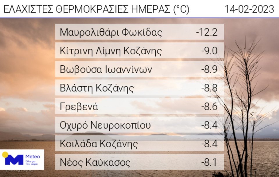 Στον πίνακα που ακολουθεί παρουσιάζονται οι 8 σταθμοί του δικτύου αυτόματων μετεωρολογικών σταθμών του Εθνικού Αστεροσκοπείου Αθηνών / meteo.gr που κατέγραψαν τις χαμηλότερες θερμοκρασίες. Όπως φαίνεται σε αυτόν, η ελάχιστη καταγράφηκε στο Μαυρολιθάρι Φωκίδας και ήταν ίση με -12.2 βαθμούς Κελσίου: