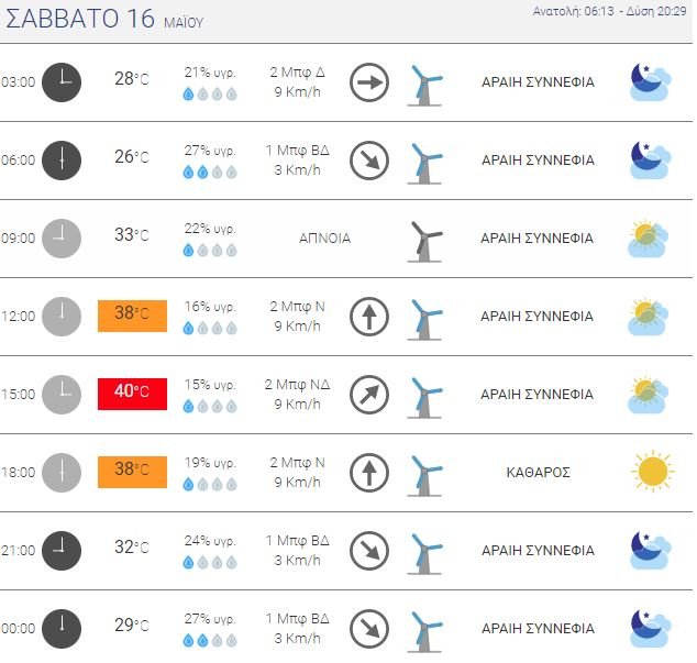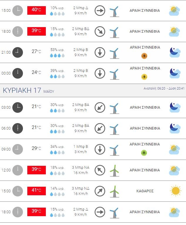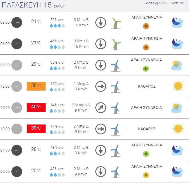 Οι προβλέψεις για 40αρια από τους μετεωρολόγους όπως φαίνεται θα πέσουν μέσα, καθώς στους πίνακες του meteo.gr καταγράφονται θερμοκρασίες άνω των 40 βαθμών, οι οποίες μάλιστα θα αρχίσουν από την Παρασκευή σε ορισμένες περιοχές. Τουλάχιστον ως την Δευτέρα αναμένονται υψηλές για την εποχή θερμοκρασίες, με την κεντρική Ελλάδα, την νότια Πελοπόνησο, την Κρήτη, αλλά και τα Δωδεκάνησα από την Δευτέρα, να καταγράφουν θερμοκρασίες άνω των 38 βαθμών Κελσίου τουλάχιστον.