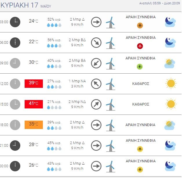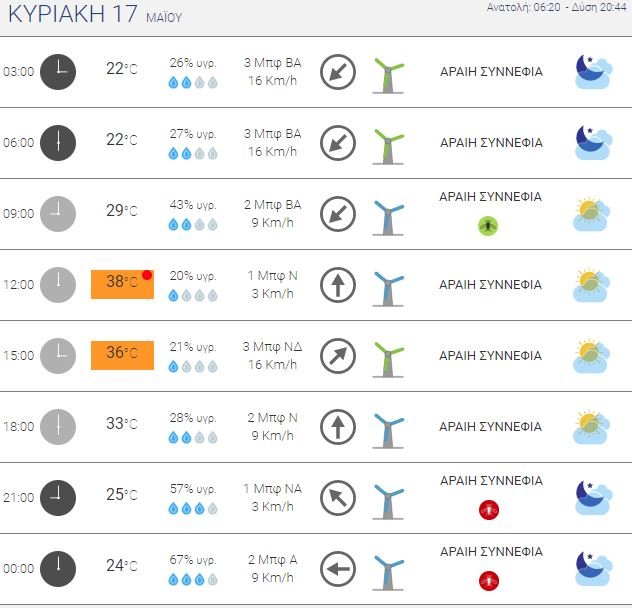 Στην Κρήτη και τον Αγιο Νικόλαο, το θερμόμετρο το Σαββατοκύριακο αναμένεται να δείξει 38 βαθμούς Κελσίου, ενώ στην Ρόδο την Κυριακή θα πιάσει 41 βαθμούς Κελσίου.