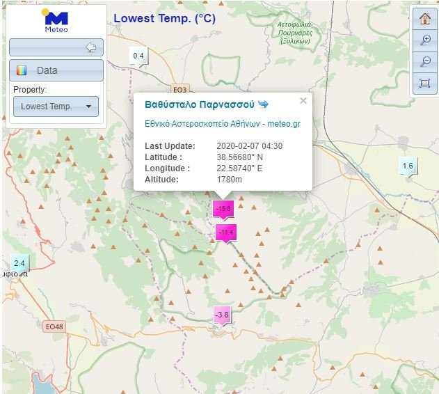 Το θερμόμετρο, σύμφωνα με το meteo.gr έφτασε μέχρι και τους -15.6 βαθμούς στον Βαθύσταλο Παρνασσού, ενώ θερμοκρασίες κάτω από τους -10, παρατηρήθηκαν στα ορεινά των Νομών Φωκίδας, Φλώρινας, Ημαθίας, Πέλλας, Δράμας και Αμφισσας, ενώ στην Πάρνηθα έφτασε ως τους -6.4 βαθμούς.