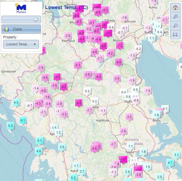 Οι χαμηλότερες θερμοκρασίες, στον χάρτη που παρουσίασε το Εθνικό Αστεροσκοπείο Αθηνών, παρατηρείται στην δυτική Μακεδονία, την Θεσσαλία, αλλά και την κεντρική Στερεά. Κάτω από το μηδέν ήταν η θερμοκρασία και στην ορεινή Αχαϊα.