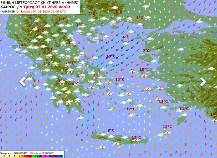 Καιρός: Νεφώσεις με βροχές ή χιονόνερο και κυρίως στην Κρήτη (ορεινά - ημιορεινά) χιονοπτώσεις, κατά διαστήματα πυκνές μέχρι το απόγευμα. Ανεμοι: Βόρειοι 8 με 10 μποφόρ, με μικρή εξασθένηση το βράδυ. Θερμοκρασία: Από 04 έως 09 βαθμούς Κελσίου.