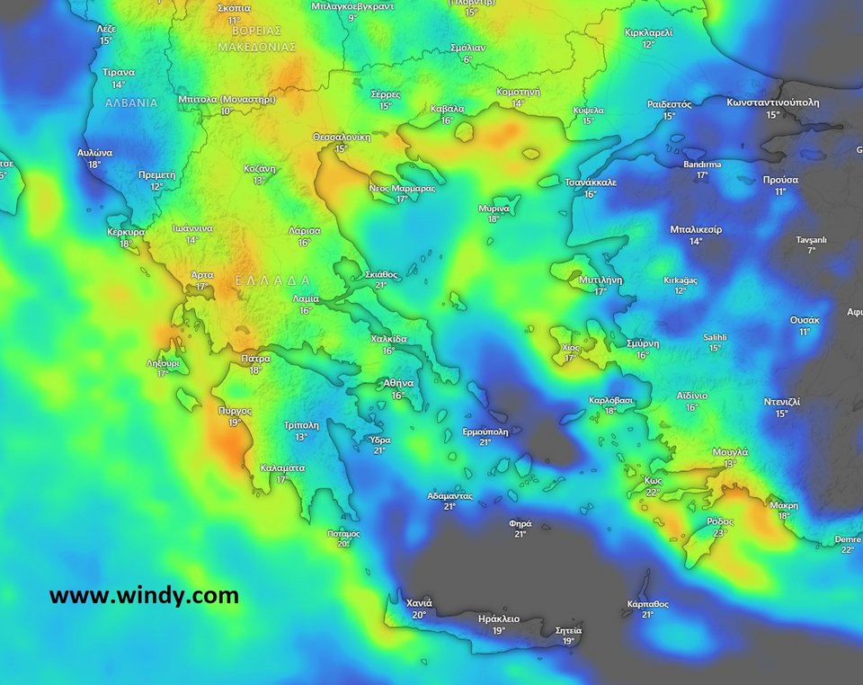Θερμοκρασία: Από 18 έως 22 και στα Δωδεκάνησα έως 26 βαθμούς Κελσίου.
