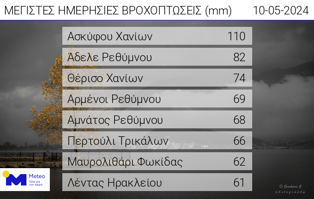 Σύμφωνα με το δίκτυο αυτόματων μετεωρολογικών σταθμών του meteo.gr/Εθνικού Αστεροσκοπείου Αθηνών, τα οκτώ μεγαλύτερα ημερήσια ύψη βροχής έως τις 18:00 της Παρασκευής 10/05 παρουσιάζονται στον πίνακα που ακολουθεί.