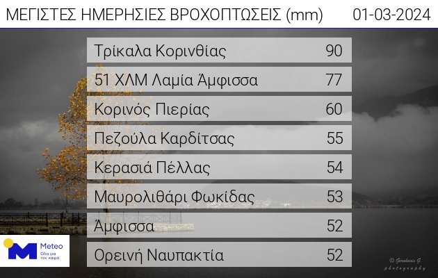 Ο μετεωρολογικός σταθμός στα Τρίκαλα Κορινθίας έως το απόγευμα κατέγραψε 90 χιλιοστά βροχής, ενώ αυτός στο 51ο Χιλιόμετρο Λαμίας-Άμφισσας κατέγραψε 77 χιλιοστά.