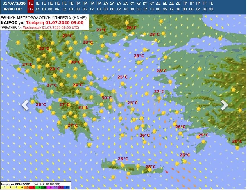 Καιρός: Αίθριος. Ανεμοι: Βορείων διευθύνσεων 4 με 6 μποφόρ. Θερμοκρασία: Από 23 έως 31 βαθμούς Κελσίου. Στην Κρήτη η μέγιστη τοπικά 3 με 4 βαθμούς υψηλότερη.