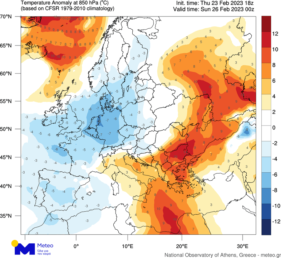 - Στον προγνωστικό χάρτη που ακολουθεί και αφορά την Κυριακή (26/2), απεικονίζεται η απόκλιση της θερμοκρασίας των αερίων μαζών σε ύψος περίπου 1.500 μέτρων, σε σχέση με τις κανονικές για την εποχή τιμές της. Οι αέριες μάζες πάνω από τη χώρα μας θα είναι 7-10 βαθμούς θερμότερες από τα κανονικά για την εποχή επίπεδα.