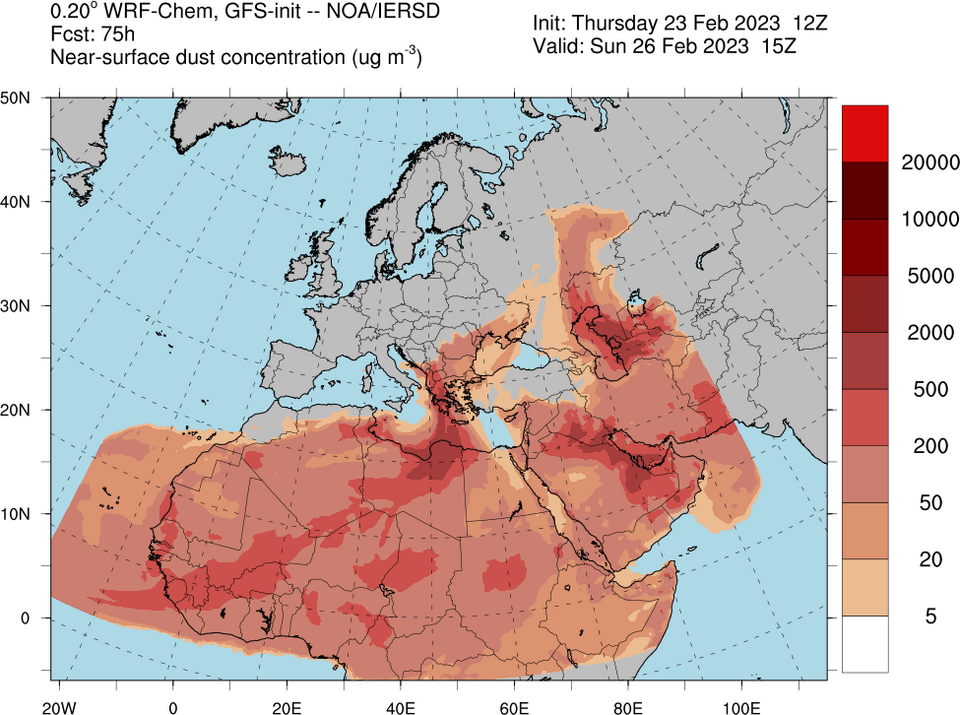 - Οι αυξημένες συγκεντρώσεις αφρικανικής σκόνης, ιδιαίτερα στα πρώτα 2 χιλιόμετρα της ατμόσφαιρας. Στον προγνωστικό χάρτη που ακολουθεί και αφορά την Κυριακή (26/2), απεικονίζονται οι συγκεντρώσεις αφρικανικής σκόνης κοντά στο έδαφος.