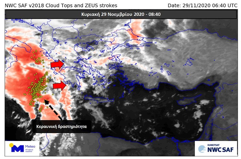 Στη δορυφορική εικόνα που ακολουθεί αποτυπώνονται τα νέφη του βαρομετρικού χαμηλού στις 08:40 ώρα Ελλάδας, ενώ με κίτρινους αστερίσκους σημειώνονται οι περιοχές όπου εκδηλώνονται καταιγίδες, σύμφωνα με το σύστημα ανίχνευσης ηλεκτρικών εκκενώσεων ZEUS.