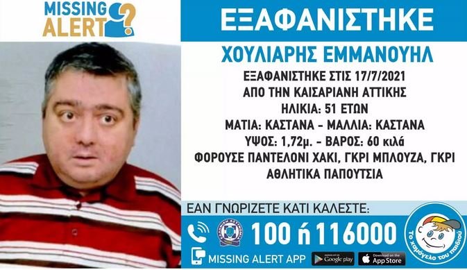 Συναγερμός έχει σημάνει στις αρμόδιες αρχές για την εξαφάνιση ενός 51χρονου άνδρα στην Καισαριανή.