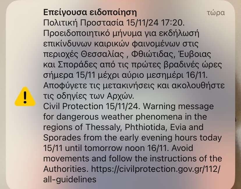 Το μήνυμα καλεί τους κατοίκους σε περιοχές της Θεσσαλίας, της Φθιώτιδας, της Εύβοιας και των Σποράδων να αποφεύγουν τις μετακινήσεις και να ακολουθούν τις οδηγίες των Αρχών, καθώς αναμένονται επικίνδυνα καιρικά φαινόμενα από τις πρώτες βραδινές ώρες σήμερα 15/11 μέχρι αύριο το μεσημέρι.