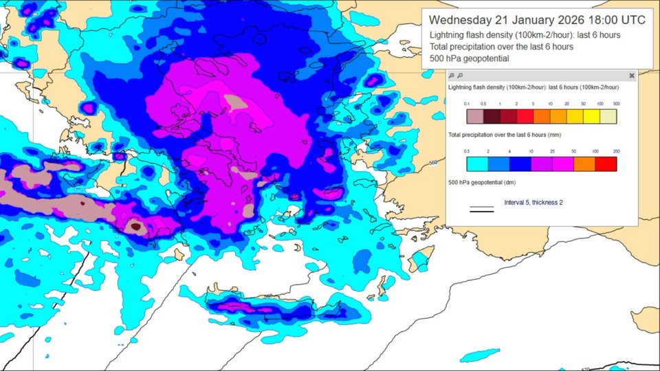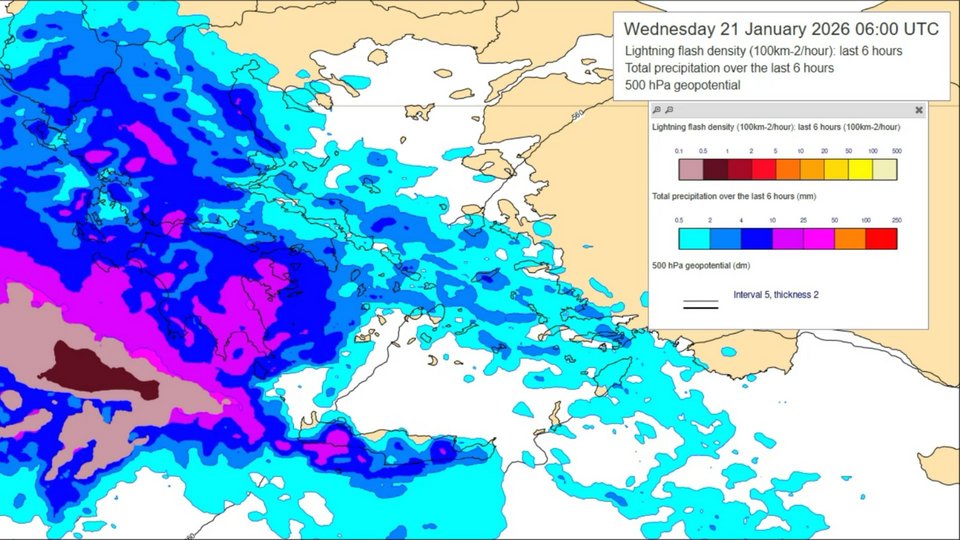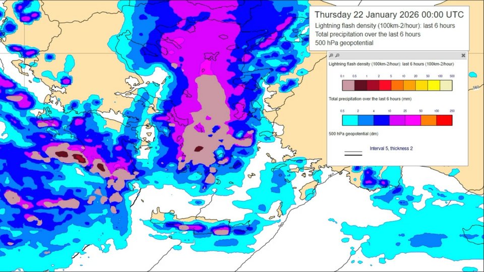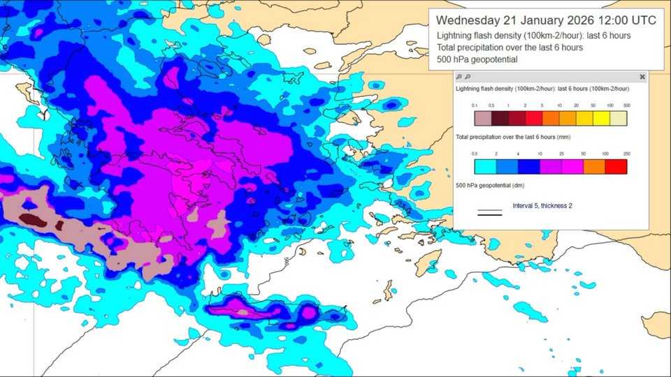 Εδώ εμφανίζεται καθαρά η ταχύτερη έλευση των βροχών. Η ζώνη υετού εξαπλώνεται γρήγορα προς την κεντρική και ανατολική Ελλάδα, με πιο συνεκτικά και εκτεταμένα φαινόμενα. Παράλληλα, κάνουν την εμφάνισή τους σποραδικοί κεραυνοί ενσωματωμένοι μέσα στη γενικευμένη βροχή. Είναι το χρονικό σημείο όπου η ανώτερη δυναμική "κουμπώνει" με την υγρασία και αυξάνει τον κίνδυνο τοπικών ραγδαιοτήτων.
