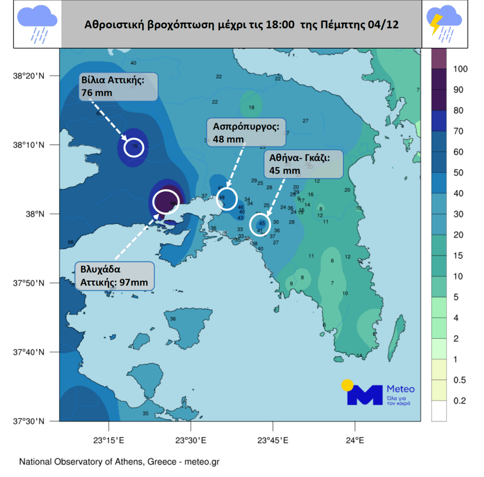 Σύμφωνα με τα στοιχεία της, στην περιοχή Βλυχάδα έγινε ρεκόρ με 97 χιλιοστά, ενώ στα Βίλια έπεσαν 76 χιλιοστά βροχής. Εντονη η κακοκαιρία και στο κέντρο, με το Γκάζι να δέχεται 45 χιλιοστά βροχής.