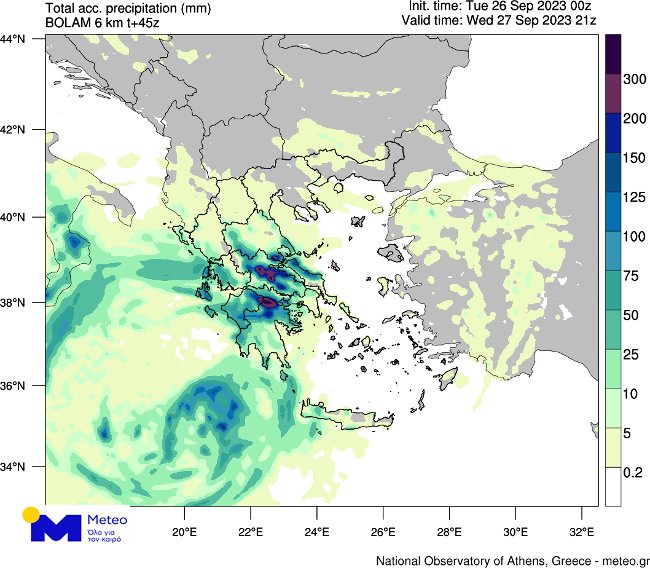 Στον προγνωστικό χάρτη που ακολουθεί απεικονίζεται η εκτιμώμενη γεωγραφική κατανομή των αθροιστικών βροχοπτώσεων (σε χιλιοστά) μέχρι και το πέρας της Τετάρτης 27/09. Με βαθύτερες αποχρώσεις αποτυπώνονται τα μεγαλύτερα ύψη βροχόπτωσης.