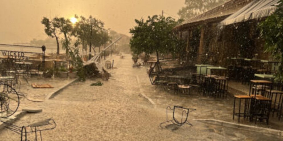Σοκαριστικές οι εικόνες από την περιοχή, δείχνουν τη δύναμη με την οποία το μπουρίνι «σφυροκόπησε» την περιοχή, προκαλώντας ζημιές στον εξοπλισμό αρκετών καταστημάτων, ξεκολλώντας και παρασύροντας ακόμη και μεγάλες επαγγελματικές ομπρέλες σε παρακείμενο δρόμο. Την ίδια ώρα, το νερό φαίνεται να έχει εισβάλει σε αρκετά από τα καταστήματα.