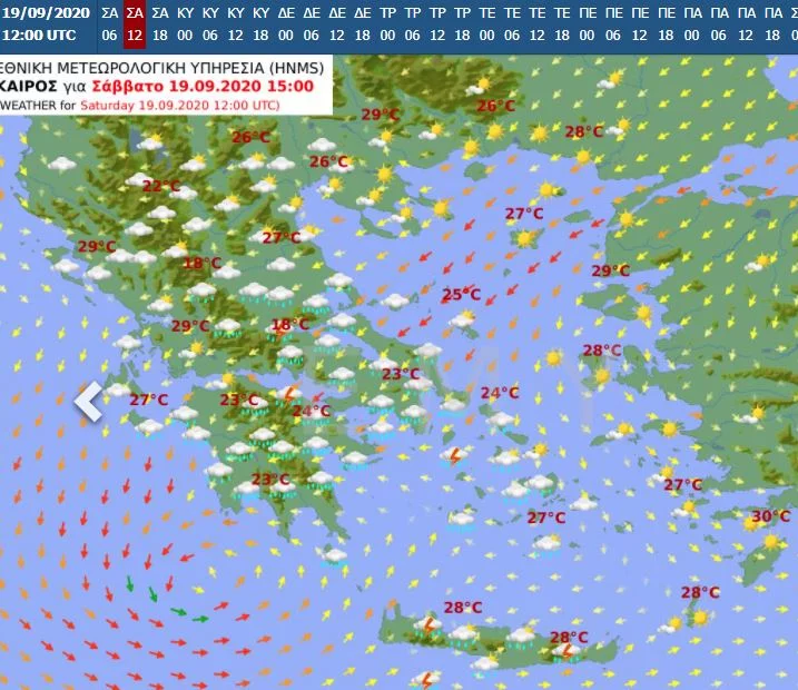 Ανεμοι: Από βόρειες διευθύνσεις 6 με 7 και τοπικά στα νότια 8 με 9 μποφόρ. Θερμοκρασία: Από 19 έως 24 βαθμούς Κελσίου.